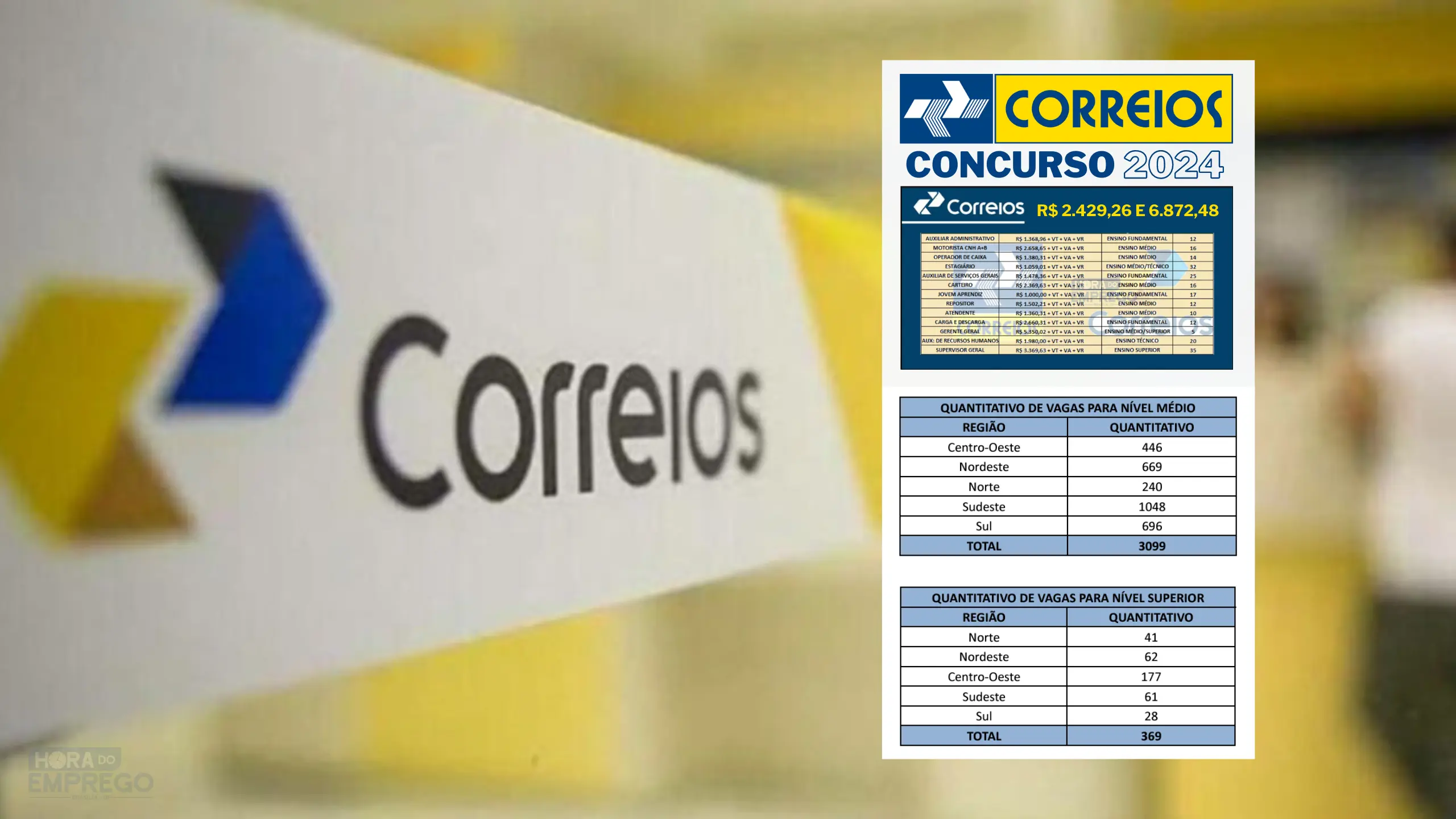 - Agente de Correios: Requer nível médio e oferece um salário inicial de R$ 2.429,26. São 3.099 vagas distribuídas entre as cinco regiões do país.