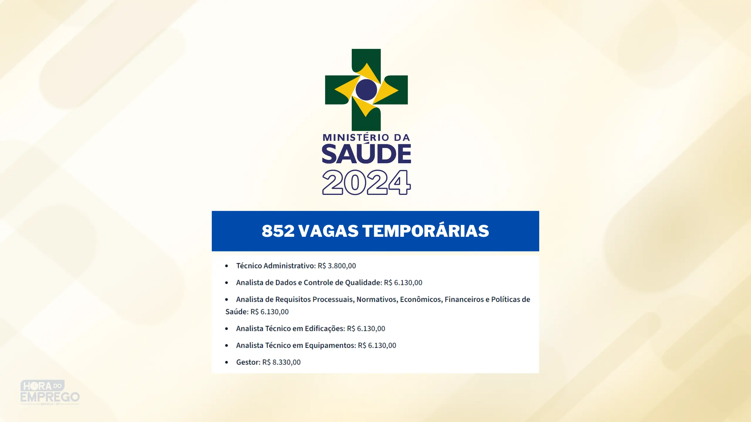 O Ministério da Saúde anunciou a abertura de 852 vagas temporárias, sendo 300 imediatas e 552 no cadastro de reserva. Essas vagas estão distribuídas em diversos cargos de nível superior e são destinadas a diferentes regiões do país.