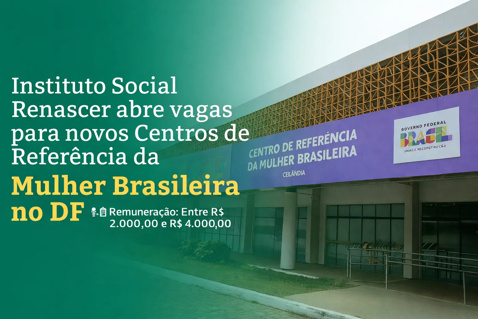 O Instituto Social Renascer, responsĂĄvel pela gestĂŁo das novas unidades do Centro de ReferĂȘncia da Mulher Brasileira (CRMB), anunciou a abertura de um processo seletivo abrangente para diversas ĂĄreas de atuação. As oportunidades sĂŁo destinadas Ă s unidades de Sol Nascente, SĂŁo SebastiĂŁo, Sobradinho II e Recanto das Emas.