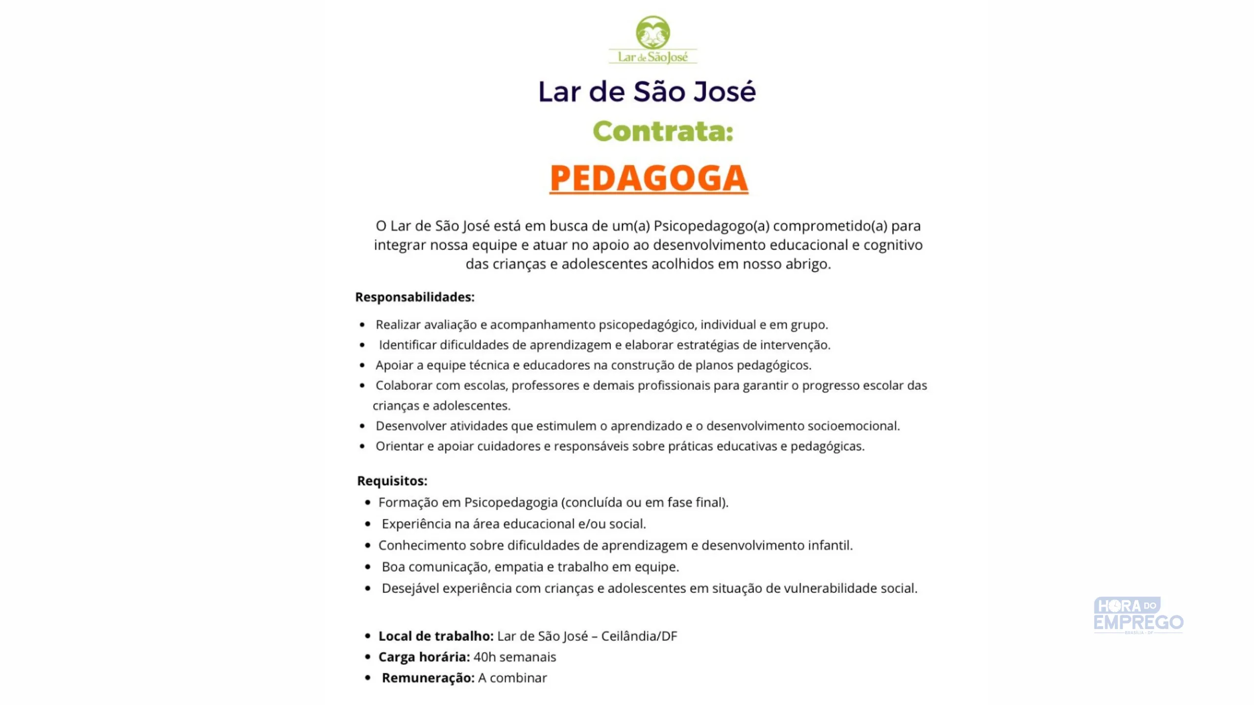 Lar de São José Contrata: PEDAGOGA