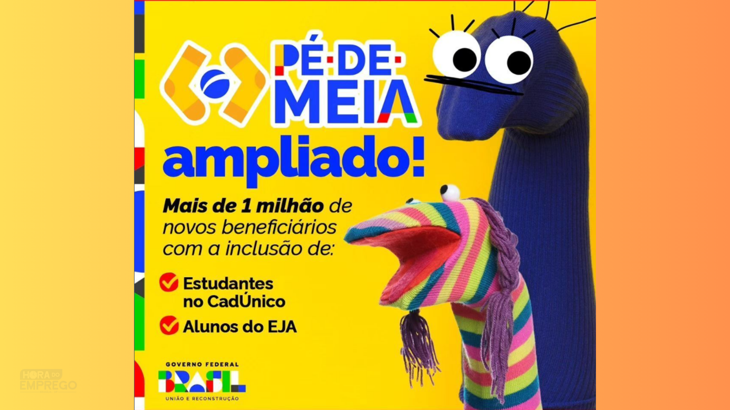 Ministério da Educação no instargam: Sim! 🧦 Agora tem Pé-de-Meia para muito mais gente! O governo federal anunciou a ampliação do programa que oferece uma poupança para estudantes do ensino médio se manterem na escola. Agora, estudantes com família inscrita no CadÚnico e renda de até meio salário mínimo e alunos da Educação de Jovens e Adultos (EJA) na mesma condição também vão receber o benefício. Isso vai trazer mais de 1 milhão de novos beneficiários ao programa, que já atende 2,7 milhões de estudantes. 🇧🇷 É o Brasil no rumo certo